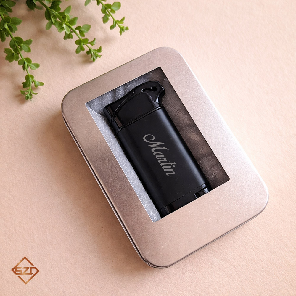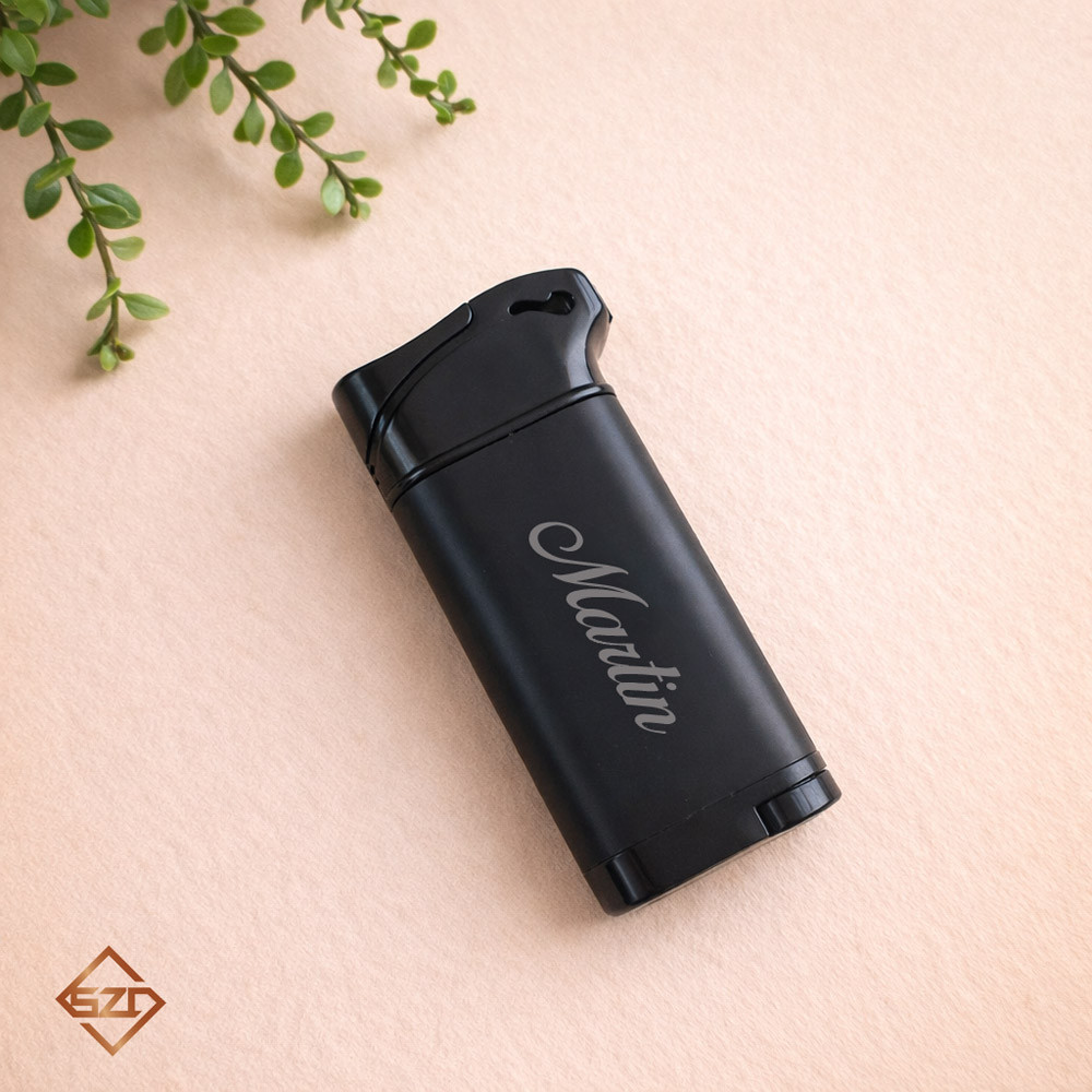 A fekete neves öngyújtó elegáns, matt fekete felülettel rendelkezik, amely tökéletes hátteret biztosít a személyre szabott gravírozásnak. Az egyedi gravírozás révén a termék tökéletesen egyedi.