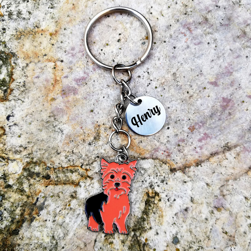 Yorkshire terrier kulcstartó gravírozott acél charmmal és saját névvel