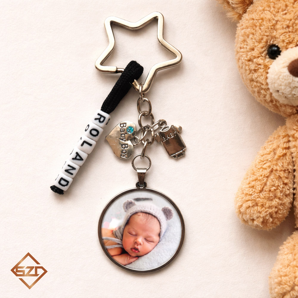 A kulcstartó precízen megtervezett mérete (30 mm átmérőjű medál, 10 cm teljes hossz) ideális a mindennapos használatra. 2 db fityegőt (baby boy, baby) tartalmaz és akril betűket. A medál elég nagy ahhoz, hogy a fénykép részletei jól láthatóak legyenek, ugyanakkor kellően kompakt, hogy kényelmesen elférjen zsebben vagy táskában.