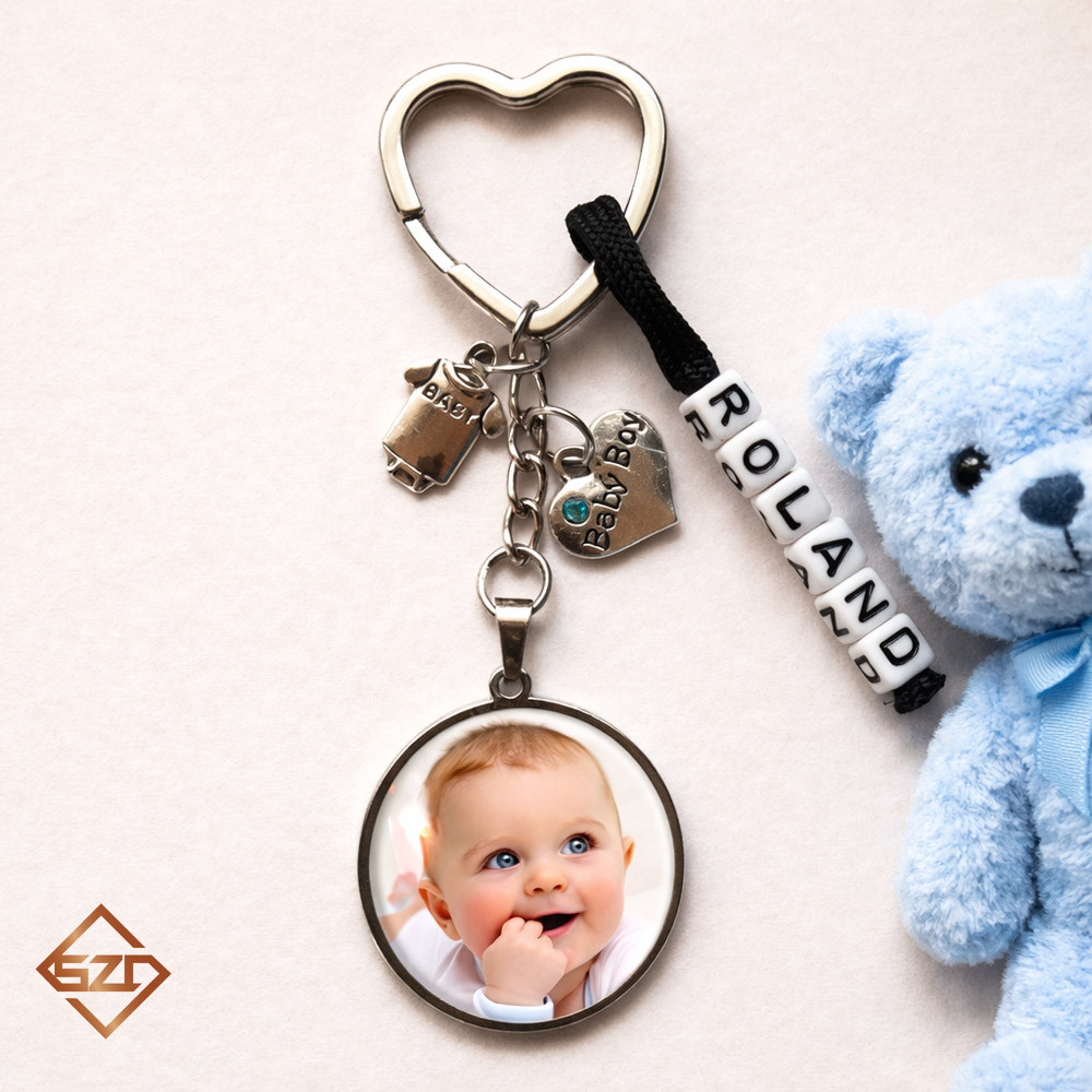 A kulcstartó precízen megtervezett mérete (30 mm átmérőjű medál, 10 cm teljes hossz) ideális a mindennapos használatra. 2 db fityegőt (baby boy, baby) tartalmaz és akril betűket. A medál elég nagy ahhoz, hogy a fénykép részletei jól láthatóak legyenek, ugyanakkor kellően kompakt, hogy kényelmesen elférjen zsebben vagy táskában.