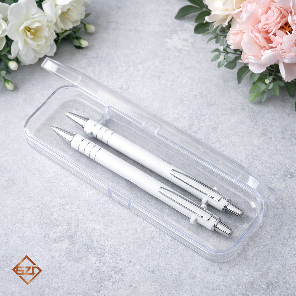 Fehér fém golyóstoll és mechanikus ceruza szett műanyag tartóban.