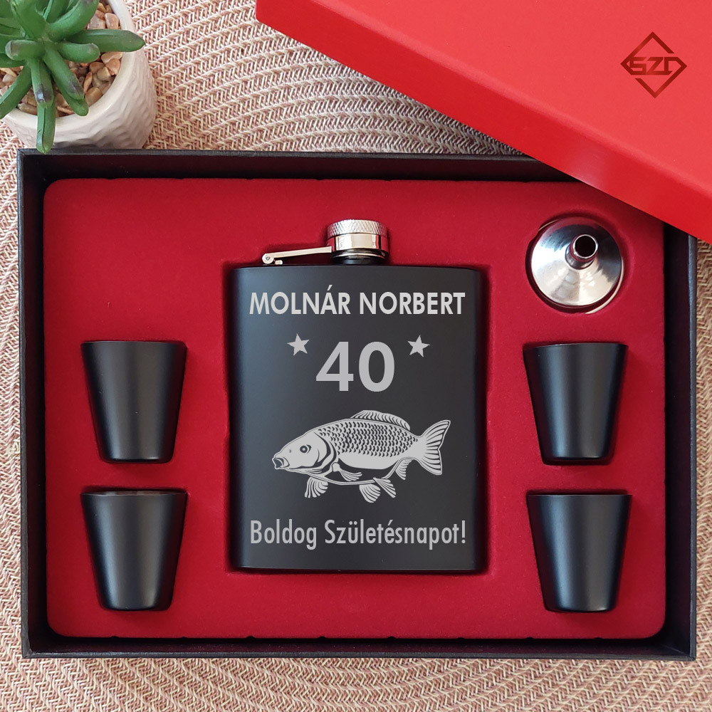 Fekete acél flaska szett névre szóló gravírozással - Születésnapi Ajándék, Ami Minden Horgászni Szeretőnek Tetszeni Fog!