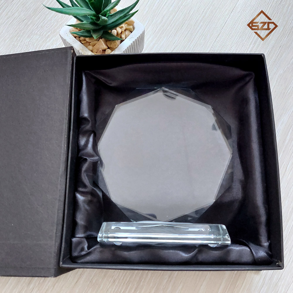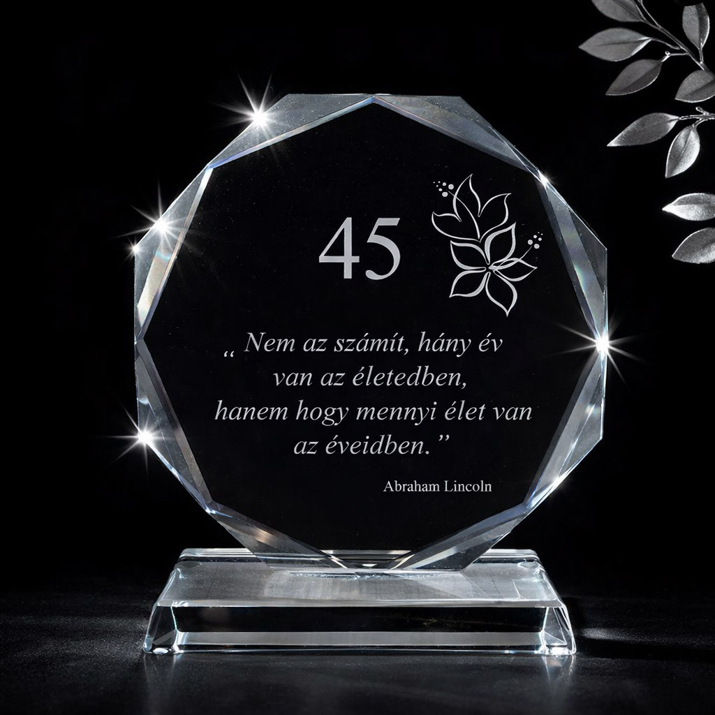 Ez az exkluzív kristálydísz díszdobozban igazi különlegesség: a 15 cm magas, csiszolt kristály tiszta felülete és mély csillogása prémium hatást kelt, miközben egy személyes üzenet, idézet vagy név gravírozásával valódi emlékké válik.